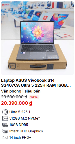 - » [TOP 5]Laptop ASUS Vivobook S14 S3407CA Ultra 5 225H RAM 16GB M2.SSD 512GB FHD